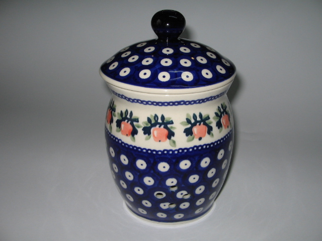 pojemnik na czosnek 1l w dekoracji tradycyjnej 70B z dwóch stron posiada cztery otwory do wentylacji. średnica 11cm wysokość 18,5cm pojemność 1l waga 0,9kg producent:Manufaktura |